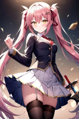 1girl, solo, long hair, breasts, looking at viewer, smile, bangs, skirt, large breasts, brown hair, shirt, long sleeves, bow, holding, sitting, school uniform, purple eyes, jacket, white shirt, weapon, ahoge, thighs, pleated skirt, wings, shoes, socks, collared shirt, sword, indoors, bowtie, black jacket, plaid, kneehighs, petals, window, red skirt, plaid skirt, blazer, demon wings