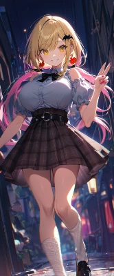1girl, A kawaii lustful vampire girl with very long wavy hair and blunt bangs and sidelocks and yellow eyes and huge breasts and baby face and droppy eyes is standing in gaming room. paw hands and v, looking at viewer, smile, (pink hair streaks:1.0), (blonde hair:1.1), (bat hair ornaments, hairclip, casual outfit, black full frame glasses, black crop tops with off shoulder, and dolman sleeve and short sleeve, paint splatter white overall dress with tin badges, long black cloth belt, light green wristband and pink oversize silicone wristband on right arm, colorful nails, lime green white high top lace up sneakers with pink shoelace), (energetic compositions, abstract particles, chromatic_aberration, abstract background:0.9), (depth of field, full body, dutch angle, from side:0.9), close to viewer, (illustration, colorful lighting:1.1), Masterpiece, top quality, very detailed,