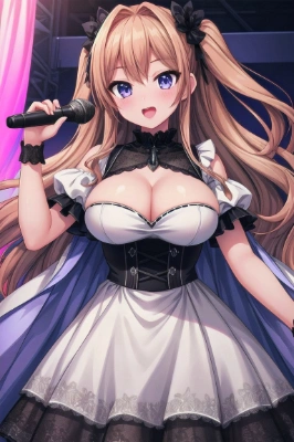 masterpiece, high quality, extremely detailed game CG, anime style3, girl, singer,singing,wink, dress,8K,award winning level,close-up,large beautiful breast,high res,amazing image quality,dynamic angle,,,,,,,,,