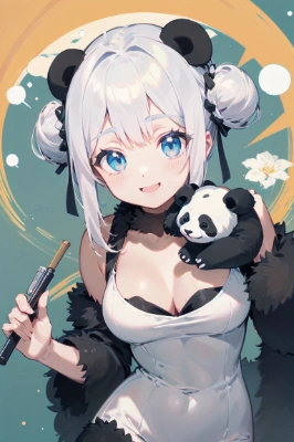 {{{{{8 years old female,young, primary school student,baby face,good girl,young,cute, kawaii,loli,pretty,little female child,kid,very small breasts,flat chest}}}}},{{{eyelashes, jewelry eyes, cute eyes,long eyelashes,brown eyes,eyes visible through hair}}},{{{ black hair, low ponytail,swept bangs, scrunchie}}} <lora:flat2:0.5> <lora:boldline:-0.5> ,smile, ((school swimsuit)),,(Panda), (panda costume:1.3), smile, cleavage,loli body,
