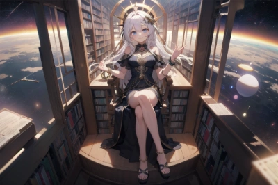 (best quarity:1.2),masterpiece,1girl with holy effect around her whole body,goddess,teenager,slender,medium breasts,holy dress,holy panty,bracelet holy,holy sandals,holy hair ornament,holy smile,sitting on chair,holy pose,(holy library in space:1.2),panty_peek,,