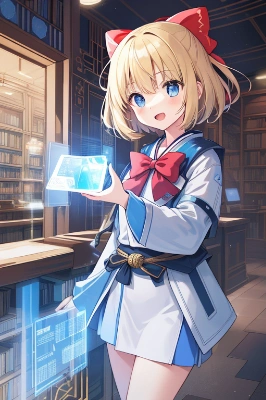 1girl organizing books in large library, blonde hair, blue eyes, short haircut, red ribbon,(hair bow:1.3),red bow, without glasses, surrounded by piles of books, Japanese anime style, youthful appearance, casual clothing, holding a book, busy atmosphere, bookshelf organization, standing, concentrating on task, varied book sizes and colors, intricate library setting, wooden bookshelves, ambient lighting, detailed textures on book covers, calm and focused expression, dynamic posture, active engagement with books, spacious library environment, natural light from windows, shadows and highlights on books, determined mood, tidy up scene, book in hand, motion implied, sorting books, clear categorization, effective use of space, inviting library space, soft shadows, architectural details of library, personalized touch in organization, color coordination, animated facial expressions, vibrant colors, careful shading, anime-like proportions, character in action, immersive setting, engaging scenario, detailed expressions, silent dedication to task, illustrative style inspired by Japanese anime, attention to detail in hair and eyes, realistic library environment with anime character, emphasis on character's organizational skills, detailed depiction of library elements, soft and warm color palette, environmental storytelling, capturing a moment of order creation, artistic interpretation of a task, creative portrayal of library maintenance, seamless blend of character and academic environment, thoughtful composition focusing on mood and theme, strategic placement of books for visual interest, imaginative representation of a library cleanup, emphasis on the joy of tidying and organization.