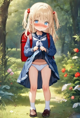 1girl little female child loli toddler preschooler two side up very long blonde hair navy blue serafuku sailor long dress navy blue sailor collar navy blue pleated dress blue eyes blush surprised [[tears]] long sleeves hair red bobbles red backpack standing on grass looking at viewer ((wind)) dynamic pose white panties socks outdoors floral garden brown shoes masterpiece best quality,