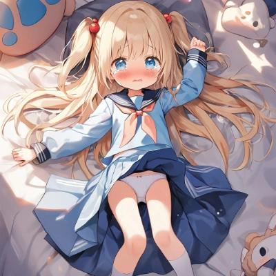 1girl little female child loli toddler preschooler two side up very long blonde hair navy blue serafuku sailor long dress navy blue sailor collar navy blue pleated dress blue eyes ((blush)) tears long sleeves hair red bobbles looking at viewer white panties socks white panties slender thin legs lying on bed lying on back spread legs (from above) masterpiece best quality,