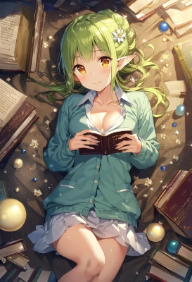 librarian girl,books,lots of books,(holding book:1.2),lie on the back,librarian uniform,open tops,downblouse,(gradation yellow green hair), [yellow hair],Chignon hairstyle, The ends of the hair are yellow tip,elf ,face to face,flower hair ornament,short ear,solo,1 woman,slender,best quality, (((extremely masterpiece))),best quality, extremely detailed,a pretty woman, shoulder length hair,amber eyes,elf, beautiful small breasts,cleavage,great joy,smile,looking at viewer, <lora:hairdetailer:1> <lora:asb-CH1:0.2> <lora:darkness_v100:1> <lora:sensualface_type2:0.75> ,cowboy shot,mid night,lots of small orbs, starry,galaxy,,delicate girl,,,,,,,