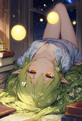 librarian girl,books,lots of books,(holding book:1.2),lie on the back,librarian uniform,open tops,downblouse,(gradation yellow green hair), [yellow hair],Chignon hairstyle, The ends of the hair are yellow tip,elf ,face to face,flower hair ornament,short ear,solo,1 woman,slender,best quality, (((extremely masterpiece))),best quality, extremely detailed,a pretty woman, shoulder length hair,amber eyes,elf, beautiful small breasts,cleavage,great joy,smile,looking at viewer, <lora:hairdetailer:1> <lora:asb-CH1:0.2> <lora:darkness_v100:1> <lora:sensualface_type2:0.75> ,cowboy shot,mid night,lots of small orbs, starry,galaxy,,delicate girl,,,high socks,attractive legs,from below,