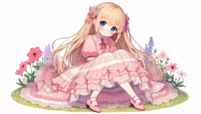 1人のとても小柄な女性。とても長い金髪、とても長いストレートヘアに小さな花飾り。レースとフリルの多いラベンダー色のワンピースを着ている。スカートの長さは膝下。青い目。ラベンダー色の靴。顔を赤くして優しく微笑んでいる。花畑に座っている。女の子座り。全身。アニメ風、詳細な描写