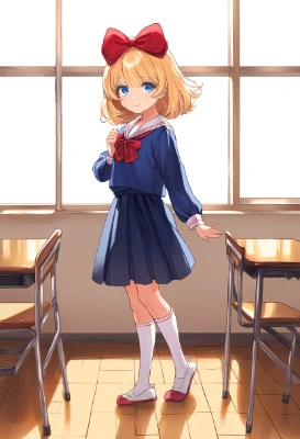 anime girl, short blonde hair, blue eyes, red ribbon in hair, (hair bow:1.3),red bow,sitting on bed,( wearing high socks:1.3), delicate and beautiful, detailed room interior, serene expression, petite figure, casual outfit, soft lighting, room with pastel colors, plush toys visible, bookshelf filled with books, window with morning light, curtains fluttering slightly (breeze:1.2), peaceful atmosphere