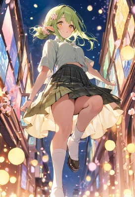 cherry blossom,sakura,lots of petals,flowery school uniform,(gradation yellow green hair), [yellow hair],Chignon hairstyle, The ends of the hair are yellow tip,elf ,flower hair ornament,short ear,(solo),1 woman,slender,best quality, (((extremely masterpiece))),best quality, extremely detailed,a pretty woman, shoulder length hair,amber eyes,elf, beautiful small breasts,great joy,smile,, <lora:hairdetailer:1> <lora:asb-CH1:0.2> <lora:darkness_v100:1> <lora:sensualface_type2:0.75> ,lots of small orbs,delicate girl,,,(high socks:1.2),attractive voluptuous legs,2 legs,