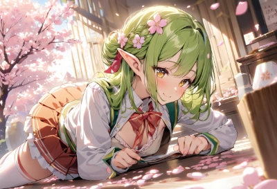 cherry blossom,sakura,lots of petals,flowery school uniform,(gradation yellow green hair), [yellow hair],Chignon hairstyle, The ends of the hair are yellow tip,elf ,flower hair ornament,short ear,(solo),1 woman,downblouse,slender,best quality, (((extremely masterpiece))),best quality, extremely detailed,a pretty woman, shoulder length hair,amber eyes,elf, beautiful small breasts,great joy,smile,, <lora:hairdetailer:1> <lora:asb-CH1:0.2> <lora:darkness_v100:1> <lora:sensualface_type2:0.75> ,lots of small orbs,delicate girl,,,(high socks:1.2),attractive voluptuous legs,2 legs,skirt,,