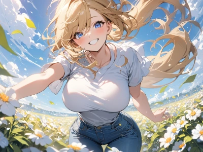 Break, 1girl, 28 years old, tall, glamor, (toned:0.5), large breasts, blue eyes, blonde hair, long hair, ahoge, ponytail, she wearing white knit,