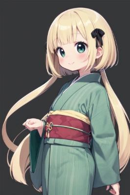 1 girl,(((very longest hair))),black hair, smile,straight Hair,hair ribbon,mintgreen stripe,Black Eyes,flat chest,straight Across bangs,princess Cut, Very Long Sideburn,roundry Head,Droping eyes,cute,Meekness,Bob Cut,long back hair,12 years Old, kimono, Blonde Hair,