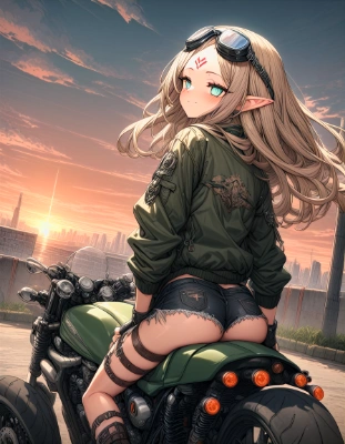 dark green long-sleeved shirt,black denim shorts, fingerless gloves, Hip Hop, Punk Look, Chain, brown leather jacket,