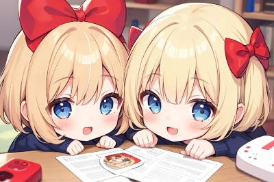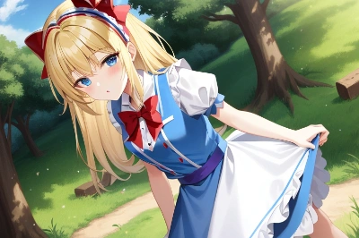 Alice in Wonderland. Alice, a curious young girl,blond hair,(hair bow:1.2),(red bow:1.2),blue eyes, has fallen down a rabbit hole and found herself in a magical world filled with peculiar creatures and strange occurrences. She wears a blue dress with a white apron and has short blonde hair. Surround her with the Mad Hatter, the Cheshire Cat, the Queen of Hearts, and other whimsical characters from the story.