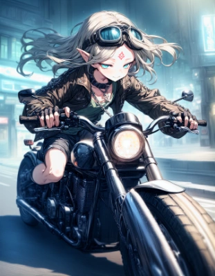 a elf riding on a naked motorcycle, correct straddling, assured hand position on motorcycle handlebars, curving, banking, spring, correct scale, correct high-detail naked motorcycle, sunset, fantasy rpg city, street,