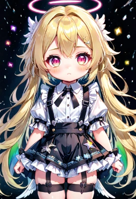 masterpiece, best quality, extremely detailed, anime <lora:flat2:0> <lora:hairdetailer:1> , anime , girl, superlonghair, puff sleeve, , pink eyes, watercolor,RAINBOWcolorBubble,openchest,offshoulder,glamorousbust,accessory,Heart,,candy,candyWorld,Whiteday,love, macarons,lace, blonde hair,