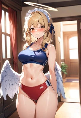 woman, androgynous, track and field wear, no sleeve, short and tight tops, midriff-baring, soft midriff, navel, high leg cut buruma, shiny thighs, shy, smile, ruffle headdress, angel halo, white big wings, standing, inside the western style mansion, ,,