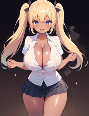 (schoolgirl, brown skin, dark skin:1.2), (sporty, speed, active, sexy gal:0.9), underboob, shiny skin, (navel:0.5), happy, sexual excitement, temptation, (soft tone, erotic mood:0.7), mini skirt, black sexy panties, bare thigh, (hot, sweat, steam:0.5), blonde hair, twintail,