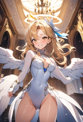 queen, smile, blonde, standing, charisma, angel halo, white big wings, competitive swimsuit, shiny thighs, standing, mansion pool,
