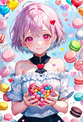 masterpiece, best quality, extremely detailed, anime, girl, skirt <lora:flat2:0> <lora:hairdetailer:1> , , Anthropomorphism, girl, longhair, puff sleeve, pink hair, pink eyes, my,SweetsWorld, child, chibi character, SweetsWorld,personification, black eyes,Sweets,cake,shortcake,ミルフィーユ,