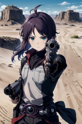 masterpiece, best quality, extremely detailed, anime, 1girl, solo, gym uniform, white baseball cap, blue short pants, socks, sneaker, blunt bangs, extra long hair, black hair, bangs over eyes, breast, ass, ,,, <lora:gunAimingAtYouV1:1>, gunatyou, gunatyou, battle field,