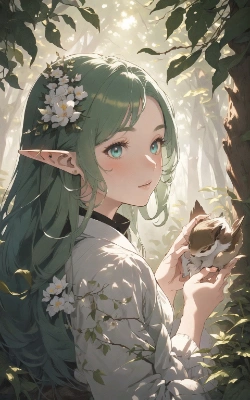 ((magic forest),high quality shadows),no visible sky,high detail wild nature,(ill maintained trail),(high detailing dappled sunlight),board hide in a bush,squirrel on a shoulder,a bird on a branch,magic circle on hand,1girl,(girl in the centrer),looking at side,(elf),blonde hair,braid sideways,show back,long hair,(solo),outdoors,afternoon,flowers,high quality,best quality,beautiful girl,perfect face,anime style,