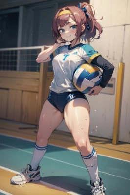 unity 8k wallpaper, anatomically correct, (((masterpiece))), (((best quality))), (((ultra detailed))), (((high-resolution))), ((super fine illustration)), ((Ultimate cutie)), ((detailed beautiful face)), ((perfect hands)), ((perfect finger)), (((good anatomy))), Solo, (gyaru), 17 years old, ((potbelly)), (Curvy), medium breasts, ((thick thighs)), Shiny hair, ((evil smile)), (smug face), ((blush)), BREAK, Adidas, ((school swimsuit)), (elbow sleeve), Knee pad, (((loose socks))), ((high top sneakers)), BREAK, ((Hold a yellow beautiful spherical 6-inch volleyball)), hand on hip ((Sweat)), (perspired), (Heavy breathing), Sense of depth, in gymnasium, in volleyball court, Lighting, Looking down, full body shot <lora:hairdetailer:0> <lora:sensualface_type2:1> ,,