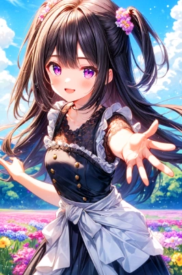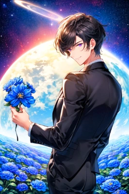 masterpiece,best quality,high quality,extremely detailed,(male austere good-looking man solo, adult age 30: 1.5), (purple eyes), cool with suspended eyes, V-shaped eyebrows, body strong and fearless, 8.5 head tall, 185 cm, ( well-groomed black short hair to neck:1.5), (bangs parted in seven thirds:1.4), slender nose, facial muscles, throat, (dressed in black suit, trousers:1.4), (smiling), (looking back), (dynamic pose), (background heaven, blue flower field, space:1.3).<lora:flat2:-0.5> <lora:hairdetailer:0.8> ,