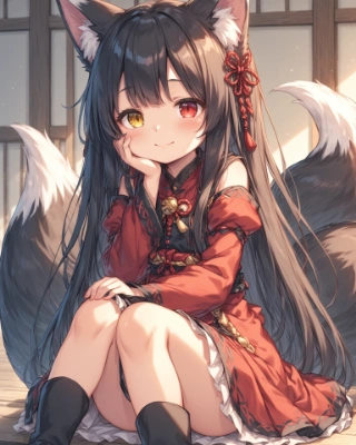 animal ears,fox ears,long hair,fox 9 tails,fox girl,