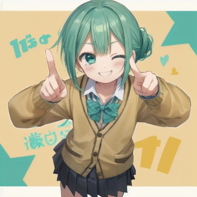 masterpiece, best quality, highres, 1otoko no ko, solo, (navy blue blazer:1.2), yellow cardigan, (brown pleated skirt), navy blue socks, loafers, かわいい, flat chest, aqua hair, aqua eyes, half updo, smile, 16 years old, Smug Face, two-finger saluting, school hallway<lora:flat2:0> <lora:hairdetailer:0.5>