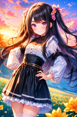 masterpiece,best quality,high quality,extremely detailed,(male austere good-looking man solo, adult age 30: 1.5), (purple eyes), cool with suspended eyes, V-shaped eyebrows, body strong and fearless, 8.5 head tall, 185 cm, ( well-groomed short black hair to neck:1.5), (bangs parted in seven thirds:1.4), slender nose, facial muscles, throat, (dressed in black suit, trousers:1.4), (Smug Face:1.3), (hands on hips:1.3), (dynamic pose), (background heaven, blue flower field, space:1.3).<lora:flat2:-0.5> <lora:hairdetailer:0.8> ,