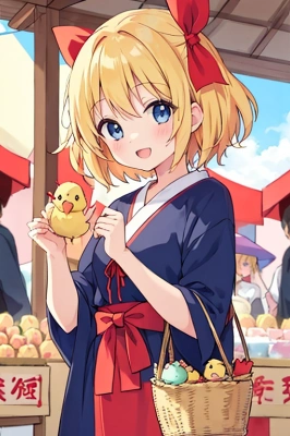 girl, short golden hair, blue eyes,blonde hair, wearing red ribbon, (hair bow:1.2),red bow,summer festival, selling lots of chicks, lively atmosphere, colorful festival stalls, cheerful expression, busy activity, detailed festival scene, warm summer evening, focus on girl and chicks, (blue eyes:1.1), (short golden hair:1.1), (red ribbon:1.3), (summer festival:1.2), (cheerful expression:1.3), (anime-style:1.5)