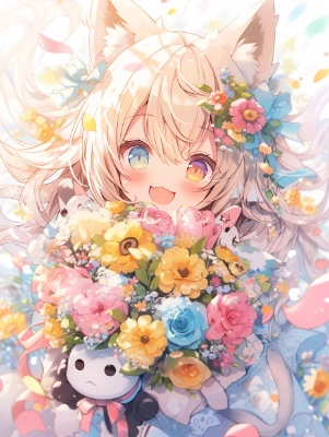 Surrounded by colorful roses, having bouquet, 1 girl, gleaming fluffily silver long wave hairstyle ,gleaming skin, gleaming fox ears, star marks, star symbol, biggest happiness smile, lace work, a lot of embroidery, fancy black and yellow gothic dress, black a lot of ribbons knee-high socks, from side, starlight reflecting, multicolored butterflies