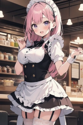 masterpiece, best quality, extremely detailed, anime, girl, miniskirt, Smug Face, girl, longhair, maid uniform, garter belt, short sleeve, pink hair, odd eyes, maid, colorful, fantasy, magic, different world, cafe, panty shot, standing,greatbust,