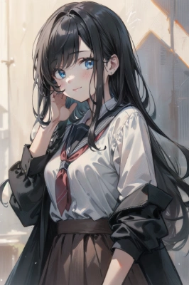 ((masterpiece), (best quality, top quality), 8k, ROW photo, extremely detailed fine touch, absurdres, (beautiful and aesthetic:1.2), professional illustration), pastel color painting, BREAK, a girl, smile, solo, (medium breasts, perfect anatomy), BREAK, A modern interpretation of a Japanese Ukiyo-e print depicting a beautiful woman with flowing black hair and delicate features, looking back over her shoulder with a captivating gaze. <lora:flat2:-0.2> <lora:hairdetailer:0.2> ,