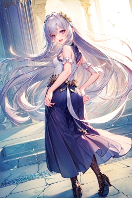 masterpiece, best quality, highly detailed CG unity 8k, illustration, Anime style, complicated, (perfect anatomy), extremely detailed 1 girl, loli, solo, full body, step like a dance, Looking Back, from behind, extremely detailed face, happy smile, open mouth, delicate hair, long hair, shiny hair, fluttering hair, fluttering long skirt, spread arms, perfect fingers, nice hand, <lora:flat2:-0.3> <lora:hairdetailer:1> ,,