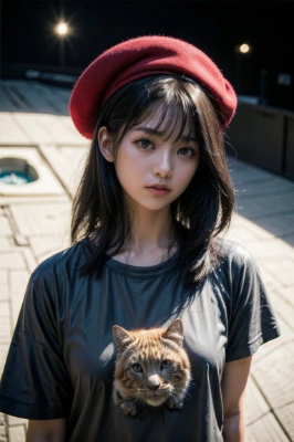 masterpiece, best quality, extremely detailed, anime, girl, skirt <lora:flat2:-1> <lora:hairdetailer:1> , Looking Back, Downcast Eyes, Beret, girl, <lora:gunAimingAtYouV1:1>, gunatyou, gunatyou, ponytail, T shirt, blonde hair, blue eyes,