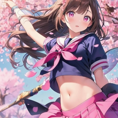 ((Cherry Blossom: 1.3), (Petals: 1.3), Petals Dancing in the Wind, School Uniform in front of navel,midriff,navel cut out, Rainbow-colored glittering fairy wings,BlazerBREAKBrown hair, beautiful pink eyes, detailed eyes, detailed expression,Masterpiece, 8K CG Rendering, Ultra Detailed, Detailed Background,perfect anatomy,