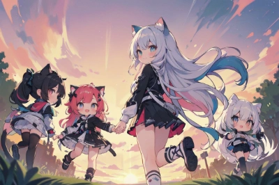 (masterpiece), (best quality),(ultra-detailed),(illustration),(extremely detailed),(perfect anatomy),(super detailed skin),(detailed),(beautiful detailed eyes),1girl,cat girl,cat ears,cat tail,multicolored hair,, ((Downcast Eyes:1.3)), longhair, blonde hair, pink hair, red eyes,sit,knees up,head tilt,(chibi:1.3),(looking away:1.3),,