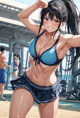 masterpiece, best quality, extremely detailed, anime, girl, skirtmasterpiece, best quality, extremely detailed, anime, girl,an adult nike women in a bikini poses with fists up in a pose, 1girl, solo, swimsuit, long hair, , a pretty woman, ponytail, black hair, smiling, blushing, sweating, <lora:flat2:0> <lora:hairdetailer:1> ,