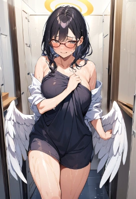 woman, plain and charming, black hair, glasses, angel halo, white big wings, a little fat, little red hood costume, shy, smile,,