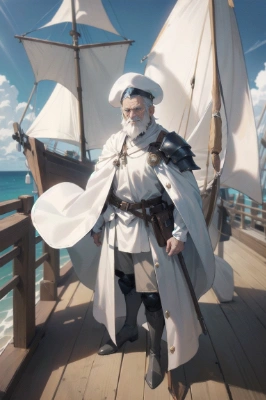 お題の「ベレー帽」にちなみ、拙著、大航海時代風異世界を舞台にした海洋冒険ファンタジー 『Los Caballeros Blanco Del Guardianes~純白の護教騎士団~』 (※下記URL参照。よく元ネタにしている『El Pirata Del Grimorio ~魔導書の海賊~』のスピンオフでもあり) に登場する、スペイン帝国をモデルにした大国の若き皇帝(神聖ローマのような帝国の皇帝も兼任)カルロマグノ一世を作成。 敵国宰相との会談のため、地中海的な場所までお出かけしているシーン。 もともとはフランス発祥ですが、ピレネー山脈を越えてバスク地方でも広まったため、スペインの王侯貴族達もベレ(ベレー帽)を愛用したりしているので、皇帝陛下にもかぶらせてみました。 こちらもまあまあ良く出た一枚。