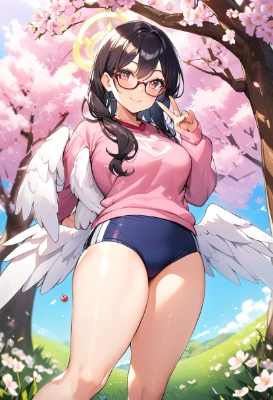 woman, plain and charming, black hair, glasses, ruffle headdress, angel halo, white big wings, smile, V-sign, long sleeve jersey tops, buruma, shiny thighs, cherry tree, spring, shy, smile, mansion garden, ,