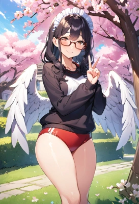 woman, plain and charming, black hair, glasses, ruffle headdress, angel halo, white big wings, dress shirt, cleavage, shy, smile,