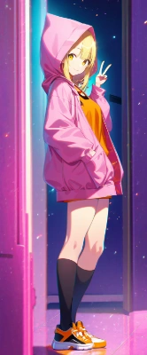 1girl, A kawaii lustful vampire girl with low twintails and bangs and sidelocks and ahoge and yellow eyes and large breasts and baby face and droppy eyes is standing in own room. hand on head and v, looking at viewer, smile, (pink hair streaks:1.0), (blonde hair:1.1), (bat hair ornaments, hairclip, black fleece jacket with sleeves past wrists, open jacket, black oversized slip shoulder t-shirt, black knee socks, black hairband, room slippers), (energetic compositions, abstract particles, chromatic_aberration, abstract background:0.9), (depth of field, full body, dutch angle, from side:0.9), close to viewer, (illustration, colorful lighting:1.1), Masterpiece, top quality, very detailed <lora:flat2:-0.85> <lora:boldline:-1>,