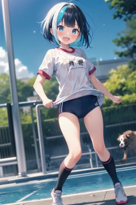 1girl, ((Blunt bangs)), brown hair, brown eyes, low pony tail, ((She wears a silver-star-hairpin on her right bang)), gray T-shirts, full body, red bloomer, smile, walking, (from side:1.4), at river, (solo), masutepiece, ultra-detailliert, best quality, <lora:flat2:-0.45> <lora:hairdetailer:0.3> ,,,,,,,,