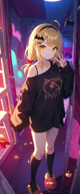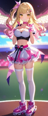 1girl, A kawaii lustful vampire girl with low-braided long hair and bangs and braided sidelocks and ahoge and yellow eyes and large breasts and baby face and droppy eyes is standing in park. hand on head and v, looking at viewer, smile, (pink hair streaks:1.0), (blonde hair:1.1), (bat hair ornaments, hairclip, indigo morning coat with golden border, glay box plated midi skirt with frill hem, white shirt, black corset belt with gold buttons, indigo ribbon bow tie, white tights, glay collar short boots, white evening gloves, mini silk hat, blue rose brooch), (energetic compositions, abstract particles, chromatic_aberration, abstract background:0.9), (depth of field, full body, dutch angle, from front:0.9), close to viewer, (illustration, colorful lighting:1.1), Masterpiece, top quality, very detailed, <lora:flat2:-0.85> <lora:boldline:-1>,