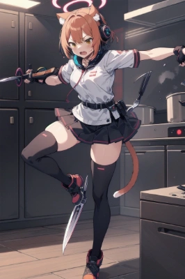 masterpiece, best quality, extremely detailed, anime, 1girl, asuna (blue archive), solo, extra long hair, weapon, maid headdress, cleavage, large breasts, apron, halo, mole on breast, mole, white thighhighs, maid, assault rifle, white gloves, blue eyes, bow, smile, ,