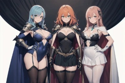 ? girls,armor,blonde hair,blue gemstone,blue hair,blush,breasts,cape,capelet,cleavage,clothing cutout,contrapposto,covered collarbone,cowboy shot,formal,gem,gloves,green eyes,green gemstone,hair between eyes,hair ornament,hand on own hip,holding,holding weapon,jewelry,lace,lace-trimmed legwear,lace trim,large breasts,legs apart,long hair,looking at viewer,looking down,miniskirt,multiple girls,orange hair,panties,pantyhose,pantyshot,pauldrons,pencil skirt,pleated skirt,purple eyes,red eyes,see-through,shoulder armor,side cutout,skin tight,skirt,skirt suit,smile,standing,suit,sword,thighhighs,transparent background,underwear,very long hair,wavy hair,weapon,white gloves ,
