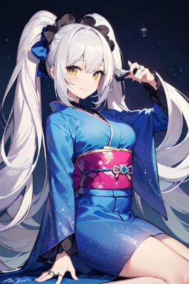 masterpiece, best quality, extremely detailed, anime, girl, skirt, Ring, a pretty woman, twintail, silver hair, yellow eyes, princess, fantasy(Fate Grand Order, Marie Antoinette, silver hair, twin tails, Her Excellency the Queen of France, for some reason, is a beautiful woman in a glittering blue kimono costume, and she looks at me and smiles),